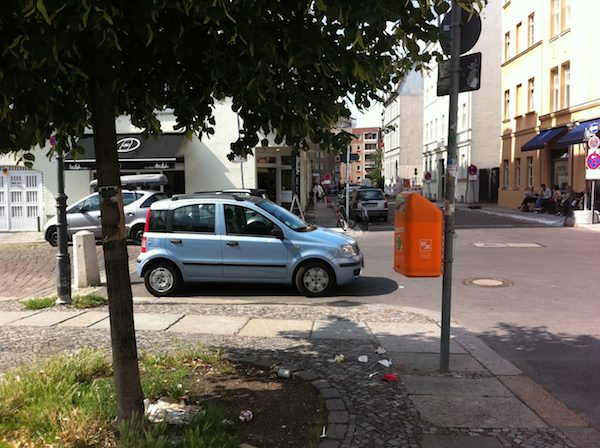 Mehrere potenzielle Probleme eines blinden Fußgängers mit Langstock können in dieser Situation mit Klicksonar vorhergesehen und souverän vermieden werden: Kollision des Kopfes mit der Baumkrone, Kollision mit dem vorstehenden Mülleimer, Kollision mit dem Verkehrsschild, Umgehung des falschparkenden Autos und trotzdem zielgerichtetes und direktes Überqueren der Straße zum weiterführenden Gehweg, weil die Hausecken alle „gesehen“ werden.