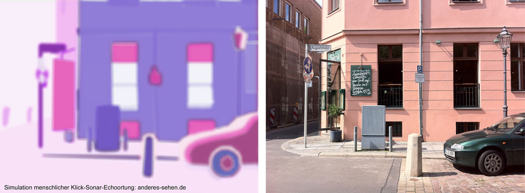 Auf dem linken Bild werden die wahrnehmbaren Informationen nur zum Teil simuliert. Mit der Entfernung des Objektes nimmt die Verzögerung des Echos zu (Echo zunehmend schwächer dargestellt). Ein flacher Winkel z.B. vom Asphalt wirft kaum Signale zurück (Echo schwächer dargestellt). Unterschiedliche Materialien (Stein, Glas, Blech in verschiedenen „Klangfarben“) werfen unterscheidbare Echos zurück. Entfernung, Material und Dichte werden also genau wie bei Sehenden unbewusst und räumlich wahrgenommen.
