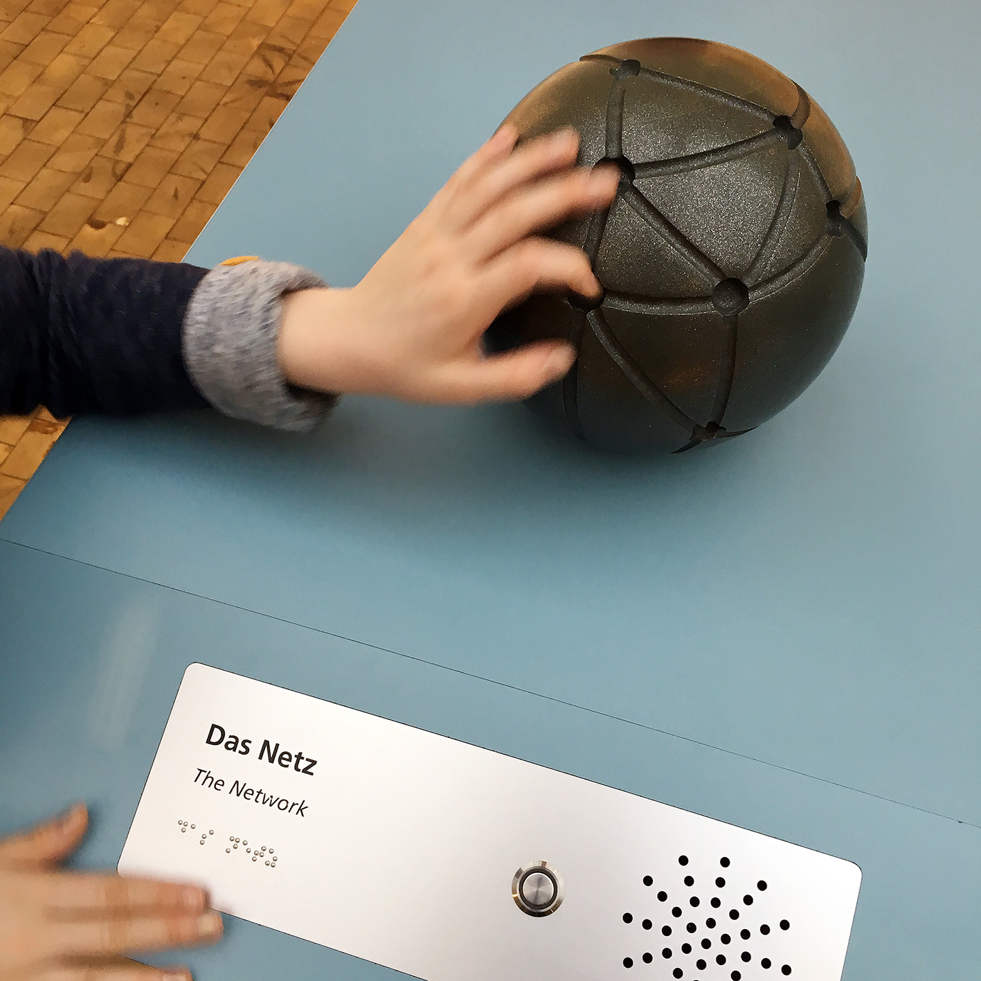 Das Netz taktile Station mit Punktschrift und Audio Button im Deutschen Technik Museum Berlin